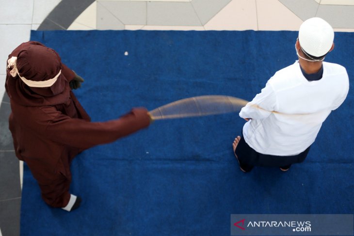 Prosesi eksekusi hukuman cambuk terhadap terpidana pelanggar hukum syariat islam di Banda Aceh, Aceh, Senin (8/3/2021). Mahkamah Syariah menvonis 10 hingga 20 kali hukuman cambuk terhadap delapan orang pelanggar peraturan daerah (qanun) nomor 6/2020 tentang hukum jinayat. Antara Aceh/Irwansyah Putra.