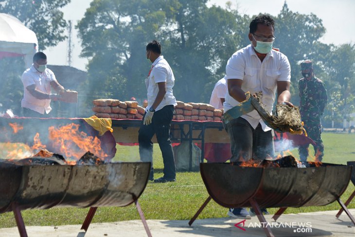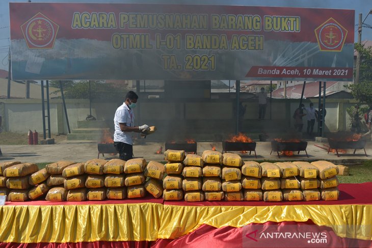 ODITURAT MILITER MUSNAHKAN GANJA DI ACEH. Prajurit TNI bersama pejabat Forkopimda Aceh memusnahkan barang bukti narkotika jenis ganja dengan cara dibakar di Banda Aceh, Aceh, Rabu (10/3/2021). Oditurat Militer I-01 Banda Aceh bersama pejabat Forkopimda memusnahkan sebanyak 158 kilogram ganja dan 13,6 kilogram sabu dan mengamankan tiga prajurit TNI sebagai pelaku kejahatan narkotika. ANTARA FOTO/Ampelsa.