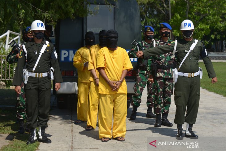 ODITURAT MILITER MUSNAHKAN GANJA DI ACEH. Polisi Milter membawa tahanan tiga prajurit TNI terlibat kasus narkotika jenis ganja saat pemusnahan barang bukti di Banda Aceh, Aceh, Rabu (10/3/2021). Oditurat Militer I-01 Banda Aceh memusnahkan sebanyak 158 kilogram ganja dan 13,6 kilogram sabu dan mengamankan tiga prajurit TNI sebagai pelaku kejahatan narkotika. ANTARA FOTO/Ampelsa.