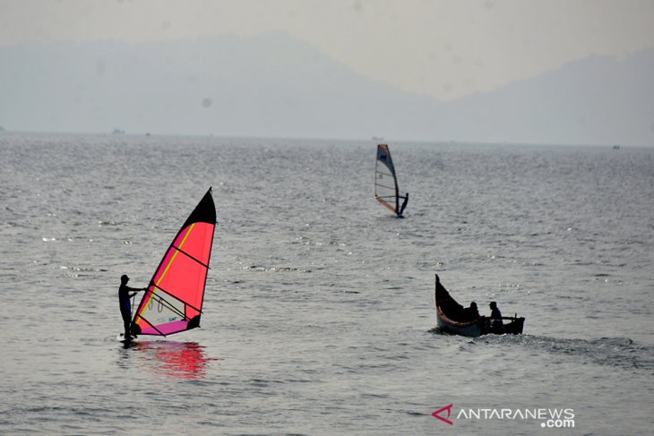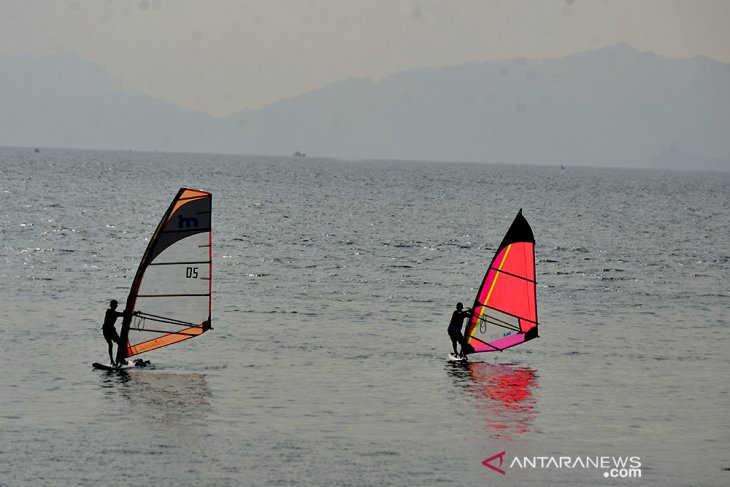 Atlet Selancar Layar Latihan Persiapan PON. Atlet selancar layar mengikuti latihan di pantai wisata Ulee Lheue, Banda Aceh, Aceh, Minggu (21/3/2021). Latihan atlet selancar layar Aceh itu dalam rangka meningkatkan kemampuan dan fisik untuk persiapan PON di Papua pada Oktober 2021 mendatang. ANTARA FOTO/Ampelsa