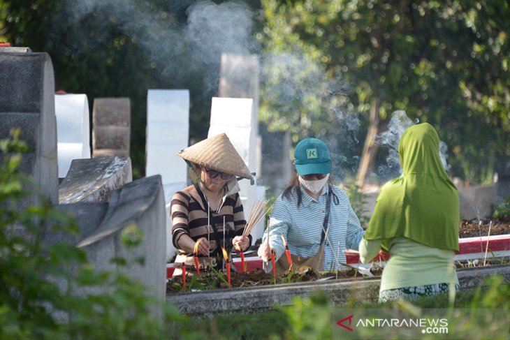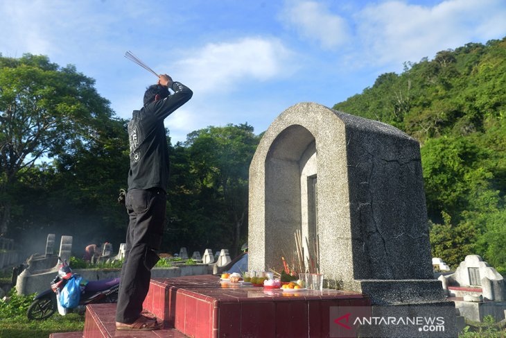 Warga Tionghoa Gelar Tradisi Ceng Beng di Aceh. Warga Tionghoa melakukan ritual sembahyang di depan makam pada perayaan tradisi Ceng Beng di Pekuburan China desa Mata Ie, Kabupaten Aceh Besar, Aceh, Minggu (28/3/2021). Tradisi Ceng Beng atau Qing Ming, merupakan ritual suci bagi masyarakat Tionghoa yang mulai digelar di tengah pandemi COVID-19 setelah sebelumnya sempat terhenti itu dilakukan secara turun-temurun setahun sekali dalam bentuk ziarah ke makam orang tua dan leluhur mereka. ANTARA FOTO/Ampelsa.