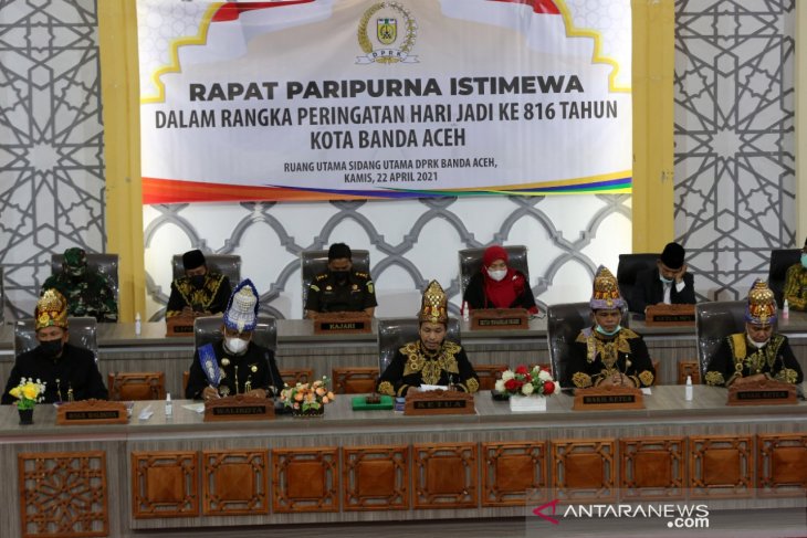 Wali Kota Banda Aceh Aminullah Usman bersama pimpinan Dewan Perwakilan Rakyat Kota (DPRK) Banda Aceh memakai pakaian adat saat mengikuti rapat paripurna istimewa dalam rangka peringatan HUT ke-816 Kota Banda Aceh di Banda Aceh, Aceh, Kamis (22/4/2021). Kota Banda Aceh yang telah berusia 816 tahun merupakan salah satu kota islam tertua di Asia Tenggara yang didirikan Sultan Johan Syah pada 22 April 1205. Antara Aceh/Irwansyah Putra