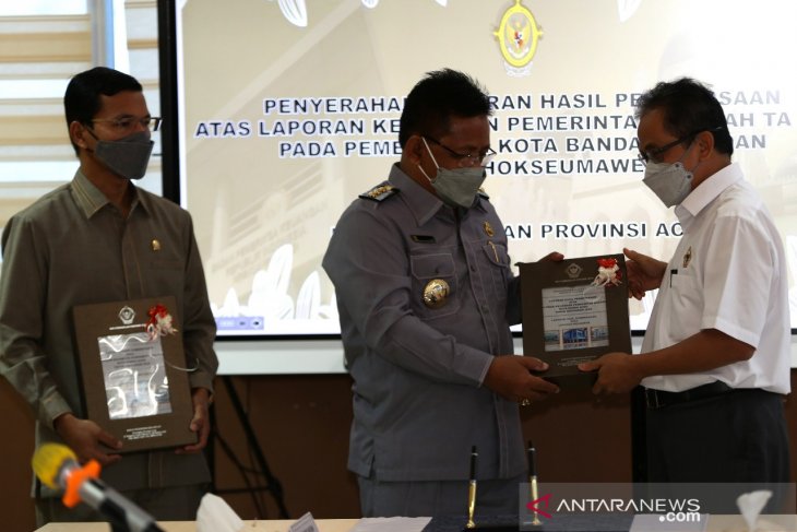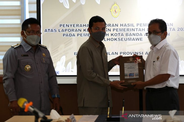 Walikota Banda Aceh Aminullah Usman (tengah) disaksikan Ketua DPRK Banda Aceh Farid Nyak Umar (kiri) menerima Laporan Hasil Pemeriksaan (LHP) atas Laporan Keuangan Pemerintah Kota Banda Aceh Tahun Anggaran 2020 dari Kepala Badan Pemeriksa Keuangan (BPK) Perwakilan provinsi Aceh Arif Agus di aula BPK, Banda Aceh, Senin (26/4/2021). Pemerintah Kota Banda Aceh meraih opini Wajar Tanpa Pengecualian (WTP) terhadap laporan keuangan tahun anggaran 2020 dari BPK. Antara Aceh/Irwansyah Putra.