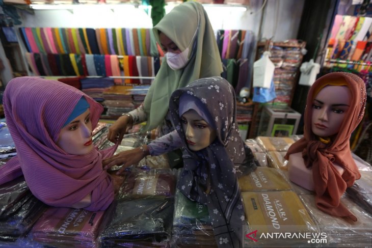 Pedagang menata kerudung (jilbab) untuk dijajakan di pasar tradisional Aceh, Banda Aceh, Aceh, Senin (26/4/2021). Menurut pedagang permintaan berbagai jenis busana muslim pada Ramadhan tahun ini juga mengalami penurunan hingga 50 pesen lebih dibanding sebelum pandemi COVID-19. Antara Aceh/Irwansyah Putra.