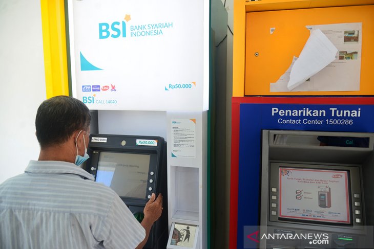 BSI PERCEPAT OPTIMALISASI LAYANAN ATM DI ACEH. Nasabah melakukan transaksi keuangan di Anjungan Tunai Mandiri (ATM) Bank Syariah Indonesia Tbk di Banda Aceh, Aceh, Minggu (9/5/2021). Bank Syariat Indonesia (BSI) di Aceh terus berupaya membenahi sistem dan operasional sebanyak 450 unit ATM ex-BRIS dari total sekitar 900 unit ATM tersebar di Aceh dalam upaya percepatan dan optimalisasi layanan keuangan masyarakat menjelang Idul Fitri. ANTARA FOTO/Ampelsa.ANTARA FOTO/AMPELSA (ANTARA FOTO/AMPELSA)