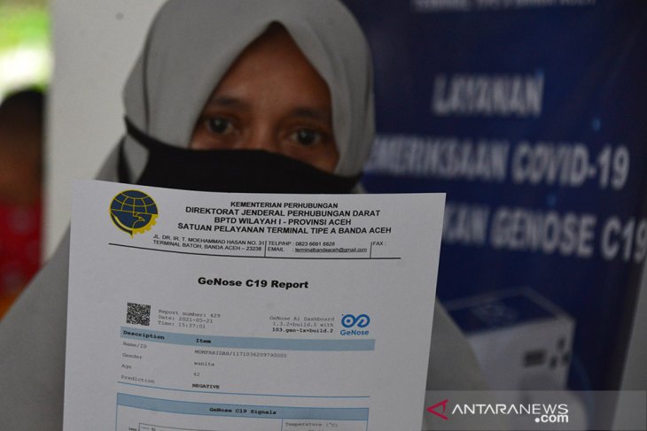 LAYANAN TES GENOSE GRATIS UNTUK PENUMPANG. Calon penumpang memperlihatkan hasil tes GeNose C19 dalam rangka deteksi COVID-19 di Terminal Tipe A Bus Umum Antarprovinsi Batoh, Banda Aceh, Aceh, Jumat (21/5/2021). Pemerintah memberikan layanan gratis tes GeNose C19 bagi calon penumpang bus di terminal tersebut untuk pencegahan penyebaran COVID-19. ANTARA FOTO/Ampelsa