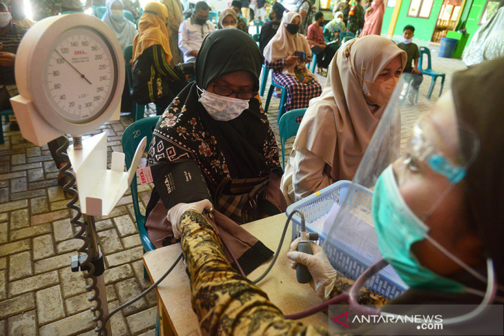 Petugas memeriksa kesehatan Ustazah (guru) dan tenaga pendidik saat berlangsung vaksinasi COVID-19 di Lembaga Pendidikan Islam Dayah Darul Ihsan, Desa Siem, Kabupaten Aceh Besar, Aceh, Kamis (1/7/2021). Gerakan vaksinasi massal COVID-19 yang menyasar ke sejumlah Lembaga Pendidikan Islam di Aceh itu dalam rangka pencegahan dan menekan angka penularan COVID-19. ANTARA FOTO/Ampelsa.