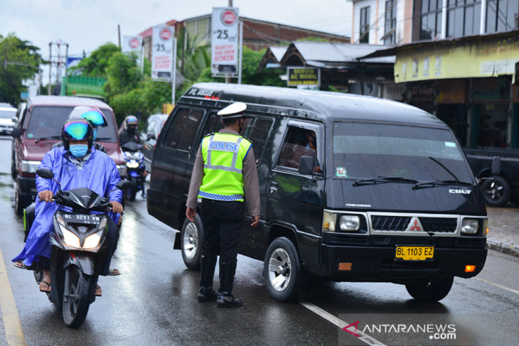 OPERASI PENGETATAN PPKM DI PERBATASAN BANDA ACEH. Personil TNI dan Polri menghentikan kendaraan warga untuk memeriksa kelengkapan surat melintas saat Operasi Pengetatan Pemberlakuan Pembatasan Kegiatan Masyarakat (PPKM) Mikro di Bundaran Lambaro, Kabupaten Aceh Besar, Aceh, Sabtu (10/7/2021). Operasi penyekatan di beberapa pintu masuk dan keluar Kota Banda Aceh sebagai daerah zona merah itu merupakan syarat melintas sesuai aturan Pengetatan PPKM Mikro dalam mengantisipasi peningkatan kasus CID-19. ANTARA FOTO/Ampelsa.