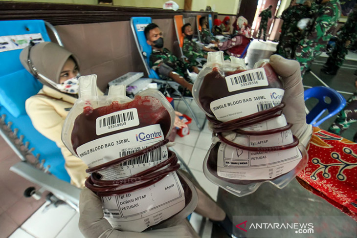 DONOR DARAH HUT TNI. Petugas Unit Donor Darah Palang Merah Indonesia (UDD-PMI) mengambil darah prajurit TNI AD saat berlangsung aksi donor darah di Lhokseumawe, Aceh. Jumat (1/10/2021). Kegiatan dalam rangka HUT Ke-76 Tentara Nasional Indonesia itu untuk membantu persediaan darah PMI selama pandemi COVID-19. ANTARA FOTO/Rahmad