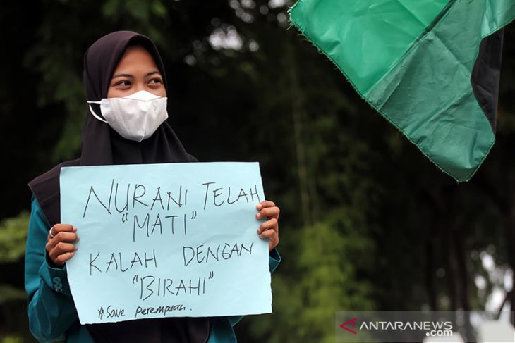 Sejumlah aktivis perempuan Korps HMI-Wati menggelar aksi stop kekerasan dan pelecehan seksual terhadap perempuan di Lhokseumawe, Aceh, Kamis (9/12/2021). Dalam aksi tersebut mereka memprotes kejahatan pelecehan seksual yang masih sering terjadi terhadap perempuan serta mendesak aparat penegak hukum bertindak tegas terhadap pelaku kejahatan pelecehan seksual. ANTARA FOTO/Rahmad