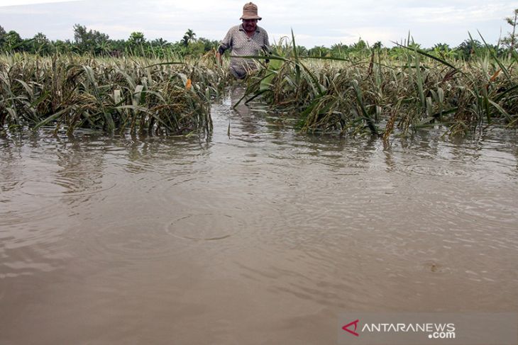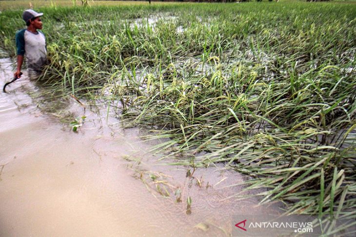 Petani mengamati padi yang terendam banjir di Desa Meunje, Aceh Utara, Aceh, Kamis (6/1/2022). Sebanyak 68 hektare tanaman padi di kawasan tersebut rusak dan terancam gagal panen akibat terendam banjir. ANTARA FOTO/Rahmad