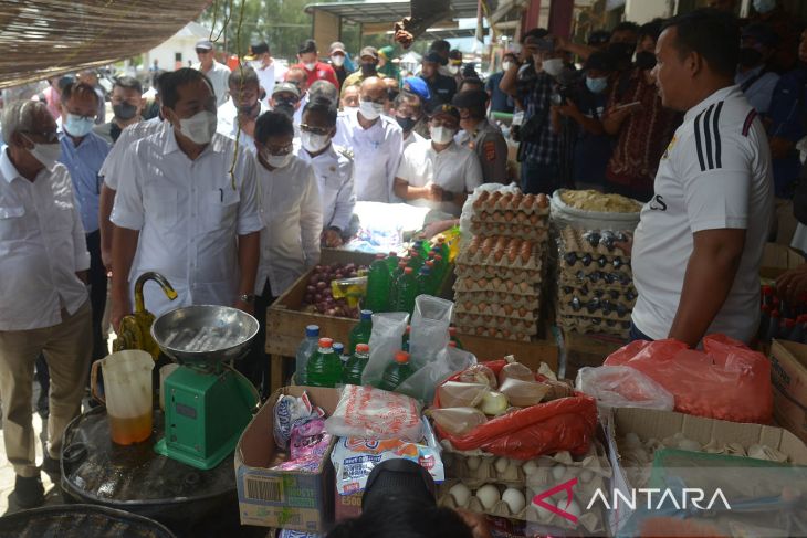 Menteri Perdagangan Muhammad Lutfi (kedua kiri) didampingi Walikota Banda Aceh Aminullah Usman (keempat kanan) mengecek harga dan stok minyak goreng saat sidak di pasar Al Mahirah, Desa Lamdingin, Banda Aceh, Sabtu (26/2/2022). Menteri Perdagangan Muhammad Lutfi menemukan harga minyak goreng kemasan di pasar tersebut masih tinggi mencapai Rp17.500 perliter dan minyak goreng curah Rp14.500 perliter karena stoknya berkurang dan pemerintah akan berupaya mengatasinya dengan memasok minyak goreng dari Medan karena stoknya di daerah itu melimpah. ANTARA FOTO/Ampelsa
