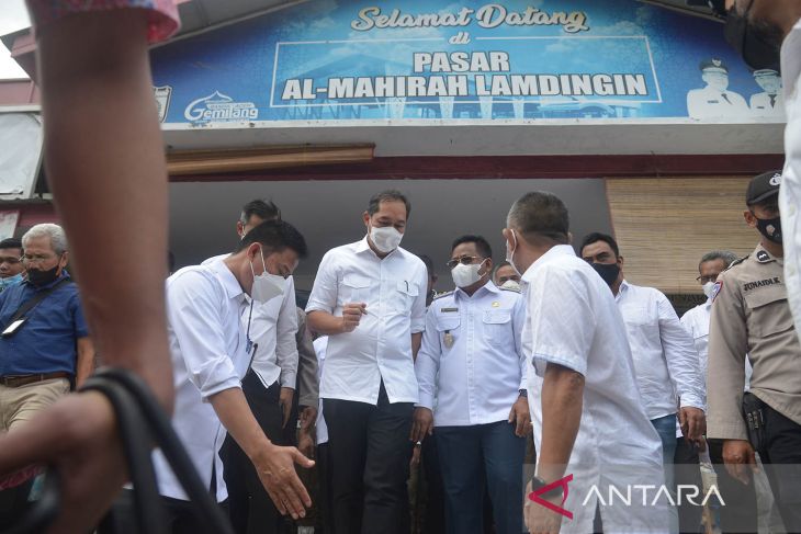 Menteri Perdagangan Muhammad Lutfi (ketiga kiri) didampingi Walikota Banda Aceh Aminullah Usman (kedua kanan) berjalan bersama saat sidak di pasar Al Mahirah, Desa Lamdingin, Banda Aceh, Sabtu (26/2/2022). Menteri Perdagangan Muhammad Lutfi menemukan harga minyak goreng kemasan di pasar tersebut masih tinggi mencapai Rp17.500 perliter dan minyak goreng curah Rp14.500 perliter karena stoknya berkurang dan pemerintah akan berupaya mengatasinya dengan memasok minyak goreng dari Medan karena stoknya di daerah itu melimpah. ANTARA FOTO/Ampelsa