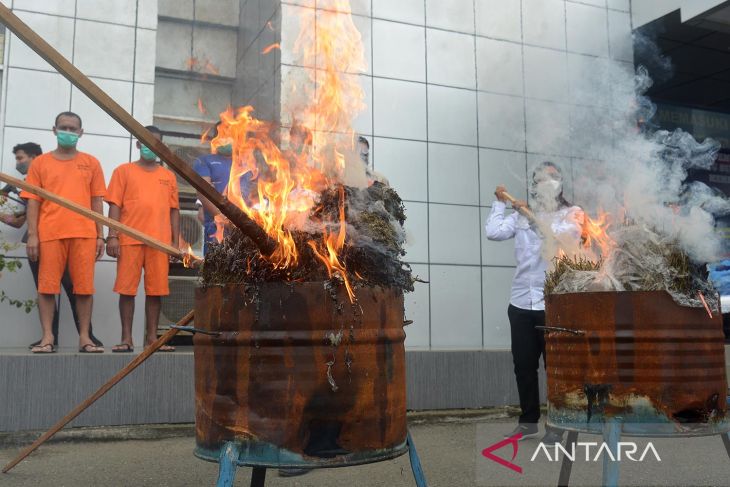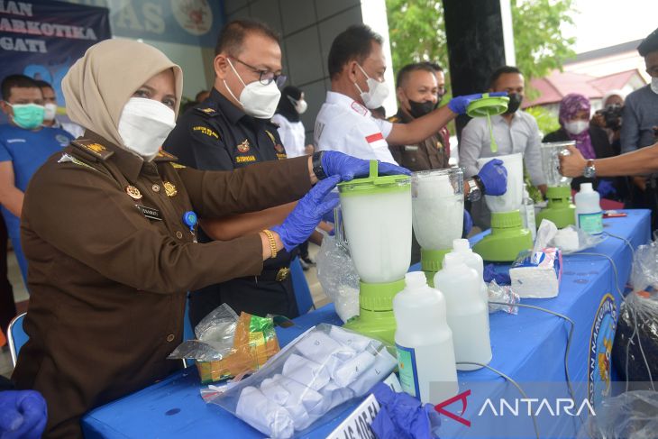 Sejumlah personel Badan Narkotika Nasional Provovinsi Aceh bersama Bea Cukai, Kejaksaan Tinggi dan Balai Besar Pengawas Obat dan Makanan memusnahkan barang bukti tindak kejahatan narkotika di Banda Aceh, Aceh, Kamis (24/3/2022). BNN Provinsi Aceh memusnahkan narkotika jenis sabu sebanyak 14,3 kilogram dan batangan ganja kering sebanyak 16,6 kilogram hasil penindakan di perairan kabupaten Aceh Timur dan Aceh Besar awal tahun 2022. ANTARA FOTO/Ampelsa
