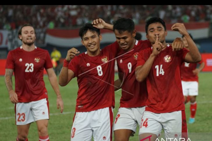 Pesepak bola Timnas Indonesia Asnawi Mangkualam (kanan) berselebrasi bersama rekan-rekannya usai membobol gawang Timnas Nepal pada laga terakhir Grup A Kualifikasi Piala Asia 2023 di Stadion Internasional Jaber Al Ahmad, Kuwait, Selasa (14/6/2022). Indonesia menang dengan skor 7-0 atas Nepal sekaligus memastikan diri lolos ke putaran final Piala Asia 2023 sebagai runner up terbaik. ANTARA FOTO/Humas PSSI/nym.