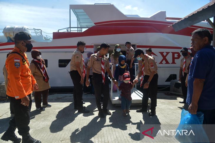 Anggota pramuka membantu memberikan pelayanan kepada penumpang saat turun dari kapal cepat di Pelabuhan Ulee Lheue, Banda Aceh, Aceh, Kamis (28/4/2022). Kehadiran anggota pramuka di pelabuhan itu merupakan Gerakan Nasional Karya Bhakti Sosial membantu memberikan pelayanan kepada penumpang saat puncak mudik lebaran Idul Fitri 1443 Hijriah. ANTARA FOTO/Ampelsa