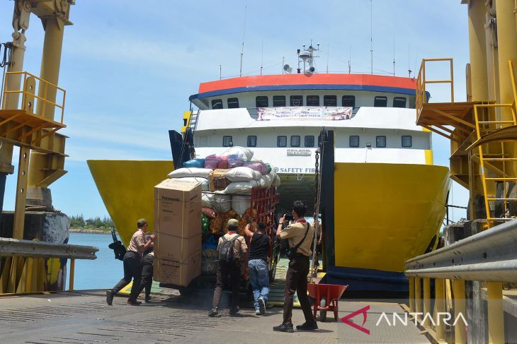 Anggota pramuka memberikan bantuan kepada truk bermuatan sembako saat menaiki kapal roro di Pelabuhan Ulee Lheue, Banda Aceh, Aceh, Kamis (28/4/2022). Kehadiran anggota pramuka di pelabuhan itu merupakan Gerakan Nasional Karya Bhakti Sosial membantu memberikan pelayanan kepada penumpang saat puncak mudik lebaran Idul Fitri 1443 Hijriah. ANTARA FOTO/Ampelsa