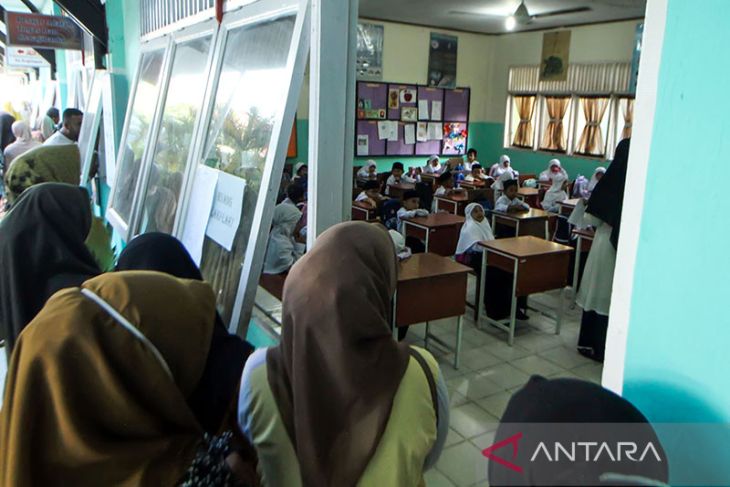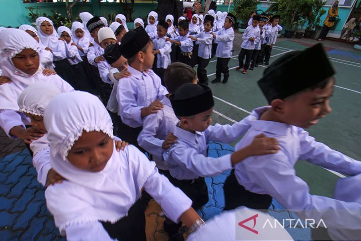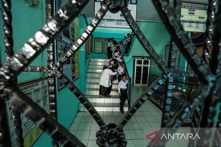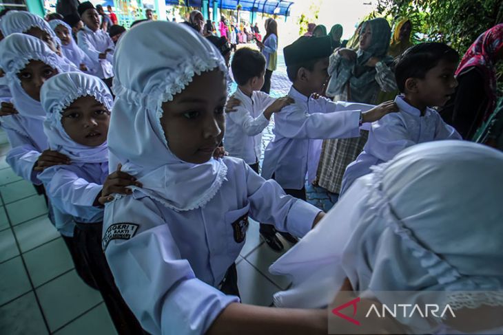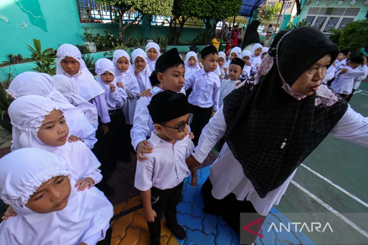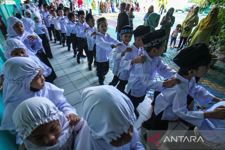 Sejumlah siswa baru kelas satu sekolah dasar mengikuti perkenalan lingkungan pada hari pertama masuk sekolah di SDN-1 Lhokseumawe, Aceh, Jumat (15/7/2022). Hari pertama masuk sekolah tahun ajaran 2022-2023 dimulai serentak, para orang tua siswa mengantar anaknya untuk mengenal lingkungan sekolah dan guru. ANTARA FOTO/Rahmad