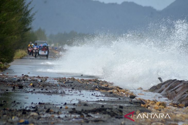 Kendaraan melintasi jalan pantai saat berlangsung gelombang tinggi di daerah pesisir Kampung Jawa, Banda Aceh, Aceh, Jumat (15/7/2022). Badan Meteorologi, Klimatologi dan Geofisika (BMKG) memperingatkan kapal nelayan, kapal tongkang, kapal ferry, kapal kargo serta kapal pesiar agar mewaspadai tinggi gelombang 1,25 hingga 2,50 meter di perarian Selat Melaka, sedangkan tinggi gelombang 2,50 hingga 4 meter di perairan Utara Sabang, perarian Barat Aceh, perarian Pulau Simeulue dan Samudera Hindia Barat Aceh hingga kepulauan Nias yang berpeluang terjadi hingga tanggal 17 Juli 2022. ANTARA FOTO/Ampelsa.
