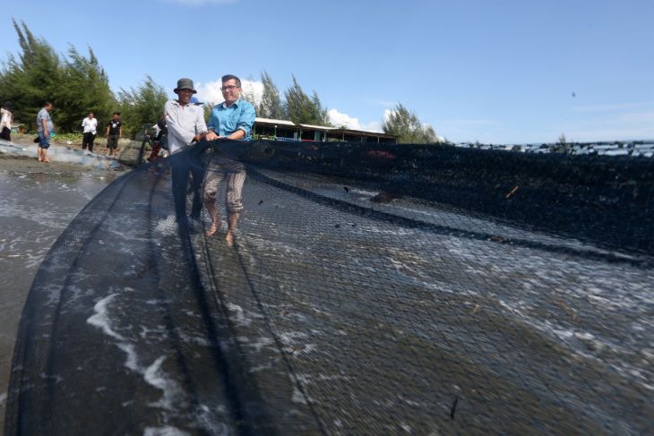 Pj Walikota Banda Aceh Bakri Siddiq menarik pukat darat bersama nelayan tradisional di pesisir pantai Kampung Jawa, Kecamatan Kutaraja, Banda Aceh, Sabtu (16/7/2022).