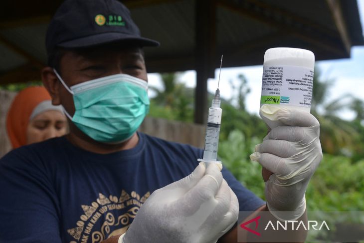 Dokter hewan Dinas Pertanian menyiapkan dosis vaksin penyakit mulut dan kuku (PMK) tahap pertama untuk ternak sapi di kandang peternak Desa Blang Mane, Kabupaten Aceh Besar, Aceh, Selasa (26/7/2022). Pemerintah Aceh menyatakan, untuk tahap pertama sudah melakukan vaksinasi PMK sebanyak 1.600 dosis dan saat ini memasuki tahap kedua sebanyak 25.100 dosis di seluruh kabupaten/kota guna mencegah penyebaran kasus penyakit mulut dan kuku pada ternak sapi. ANTARA FOTO/Ampelsa.ANTARA FOTO (ANTARA FOTO)