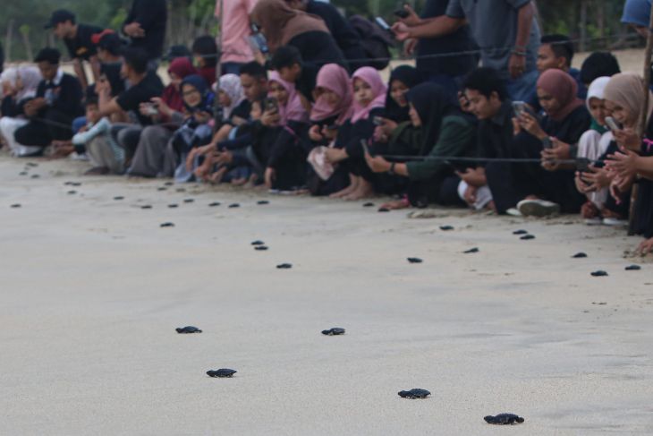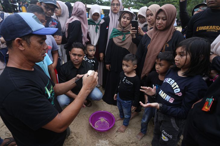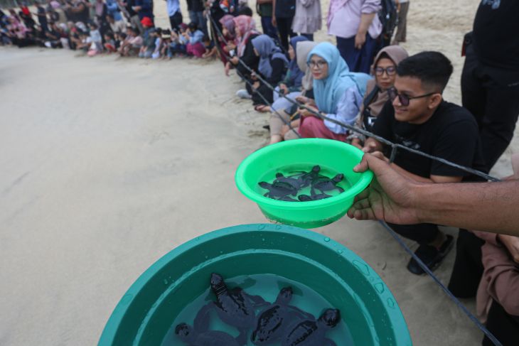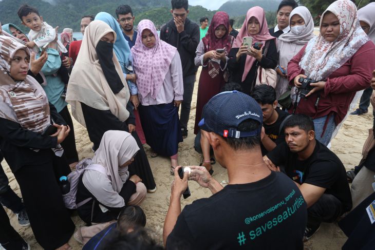 Komunitas Konservasi Penyu Lampuuk bersama wisatawan melepasliarkan tukik lekang (Lepidochlys olivacea) di Pantai Lampuuk, Aceh Besar, Aceh, Jumat (3/3/2023). Antara Aceh/Khalis Surry