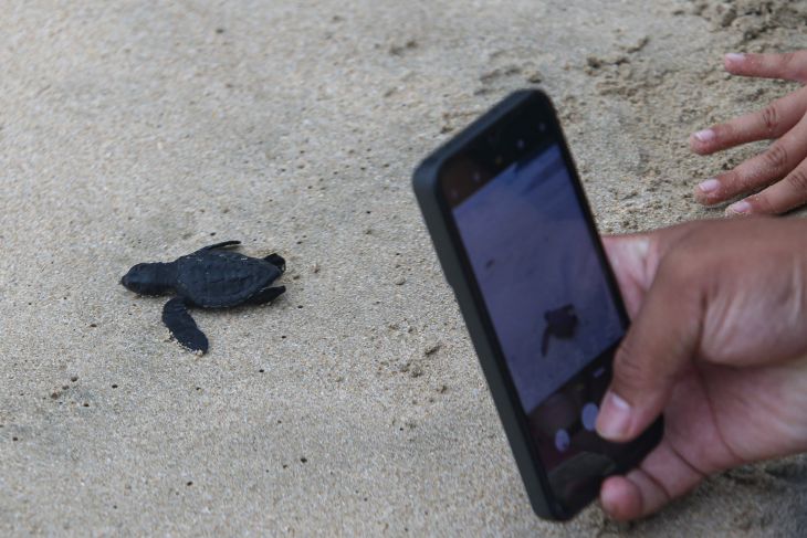 Tukik lekang (Lepidochlys olivacea) yang berhasil ditetaskan secara semi alamiah berjalan menuju Pantai Lampuuk, Aceh Besar, Aceh, Jumat (3/3/2023). Antara Aceh/Khalis Surry