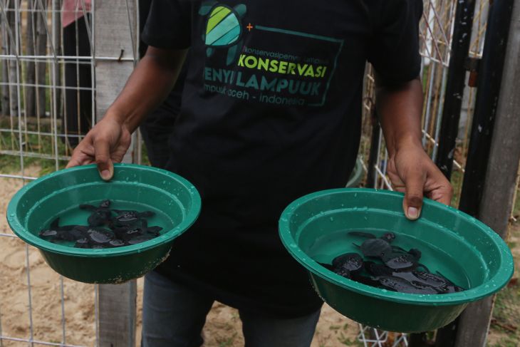Pegiat dari Komunitas Konservasi Penyu Lampuuk mempersiapkan tukik lekang (Lepidochlys olivacea) untuk dilepasliarkan di Pantai Lampuuk, Aceh Besar, Aceh, Jumat (3/3/2023). Antara Aceh/Khalis Surry