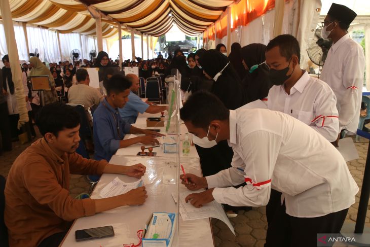 Peserta calon Pegawai Pemerintah dengan Perjanjian Kerja (PPPK) Kementerian Agama melakukan registrasi untuk mengikuti seleksi kompetensi dengan Computer Assisted Test (CAT) di gedung Amel Convention, Banda Aceh, Aceh, Kamis (23/3/2023). Antara Aceh/Irwansyah Putra