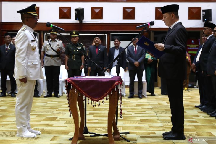 Penjabat (Pj) Bupati Pidie Jaya Jailani Beuramat dilantik oleh Pj Gubernur Aceh Achmad Marzuki di Banda Aceh, Aceh, Senin (5/2/2024). Jalaini Beuramat dilantik sebagai Pj Bupati Kabupaten Pidie Jaya menggantikan Said Mulyadi yang telah purna tugas. (ANTARA FOTO/IRWANSYAH PUTRA)