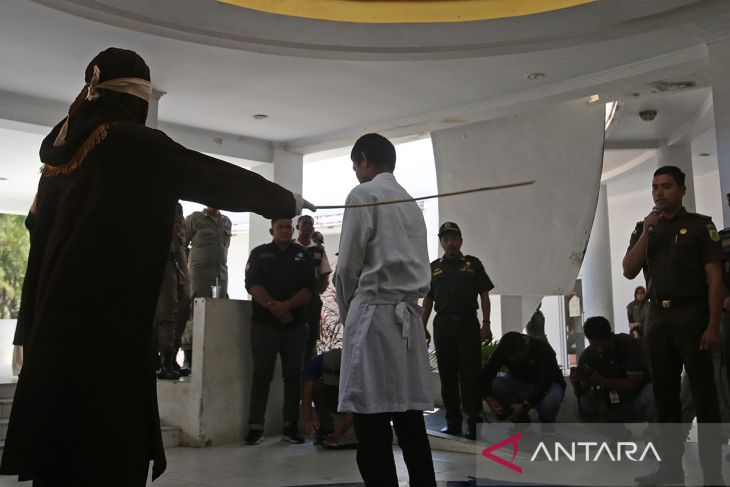 Seorang eksekutor (kiri) melakukan eksekusi hukuman cambuk terhadap terpidana pelanggaran Syariat Islam di Taman Sari, Banda Aceh, Aceh, Kamis (30/1/2025). Mahkamah Syariat Islam di daerah itu menjatuhkan putusan hukuman cambuk kepada empat terpidana pelanggaran Syarian Islam dalam kasus judi online dengan masing-masing delapan hingga 22 kali cambuk setelah dipotong masa tahanan. ANTARA FOTO/Ampelsa.