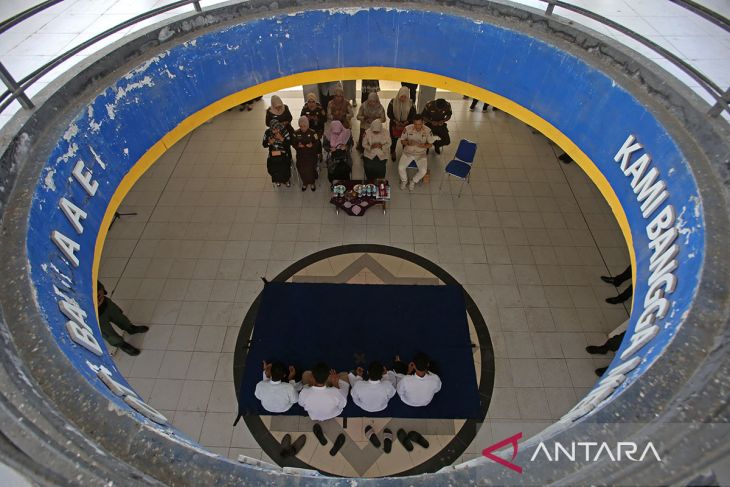 Empat terpidana mengenakan baju seragam putih duduk bersimpuh berdoa sebelum menjalankan hukuman cambuk di Taman Sari, Banda Aceh, Aceh, Kamis (30/1/2025). Mahkamah Syariat Islam di daerah itu menjatuhkan putusan hukuman cambuk kepada empat terpidana pelanggaran Syarian Islam dalam kasus judi online dengan masing-masing delapan hingga 22 kali cambuk setelah dipotong masa tahanan. ANTARA FOTO/Ampelsa.