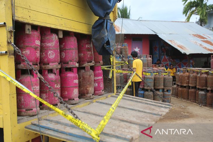 Polisi memasang garis polisi pada barang bukti tabung gas elpiji non subsidi saat penggrebekan gudang elpiji ilegal di Desa Ateuk Jawo, Banda Aceh, Aceh, Jumat (23/5/2025). Dalam operasi tersebut, tim gabungan Polres Banda Aceh, Intel Kodam Iskandar Muda, Pertamina dan Disperindag Aceh mengamankan satu unit gudang elpiji tanpa izin usaha berserta peralatan oplosan bbm, sebanyak 1.212 tabung gas elpiji non subsidi, sejumlah drum untuk penyimpanan minyak avtur, satu unit truk bermuatan tabung gas elpiji dan mengamankan tujuh pekerja. ANTARA FOTO/Ampelsa.