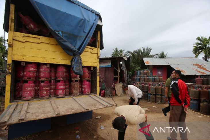 Personil Polri mengamankan barang bukti mobil truk bermuatan tabung gas elpiji non subsidi saat penggrebekan gudang elpiji ilegal di Desa Ateuk Jawo, Banda Aceh, Aceh, Jumat (23/5/2025). Dalam operasi tersebut, tim gabungan Polres Banda Aceh, Intel Kodam Iskandar Muda, Pertamina dan Disperindag Aceh mengamankan satu unit gudang elpiji tanpa izin usaha berserta peralatan oplosan bbm, sebanyak 1.212 tabung gas elpiji non subsidi, sejumlah drum untuk penyimpanan minyak avtur, satu unit truk bermuatan tabung gas elpiji dan mengamankan tujuh pekerja. ANTARA FOTO/Ampelsa.