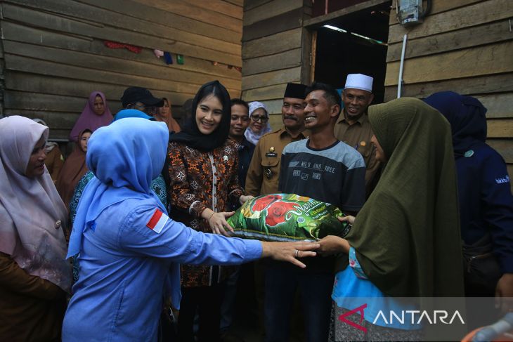 Wakil Menteri Kependudukan dan Pembangunan Keluarga/Wakil Kepala BKKBN, Ratu Ayu Isyana Bagoes Oka (ketiga kiri) menyerahkan bantuan pangan beras kepada seorang ibu hamil dari keluarga prasejahtera saat kunjungan ke daerah pedalaman Desa Siron Blang, kabupaten Aceh Besar, Aceh, Selasa (7/10/2025). Kunjungan Ratu Ayu Isyana Bagoes Oka ke kampung potensi stunting di daerah itu untuk mensosialisasikan program Gerakan Orang Tua Asuh Cegah Stunting (Genting) melaui edukasi kepada masyarakat dan menggalang kolaborasi dengan semua pihak dalam pemenuhan nutrisi ibu hamil, program makan bergizi gratis serta menjaga kesehatan lingkungan. ANTARA FOTO/Ampelsa.