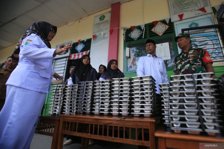 Guru bersama petugas Babinsa melakukan pengecekan Makanan Bergizi Gratis (MBG) saat launching perdana di Sekolah Madrasyah Ibtidaiyah Negeri (MIN) 18 desa Biluy, kecamatan Darul Kamal, kabupaten Aceh Besar, Aceh, Senin (13/10/2025). Badan Gizi Nasional berupaya memperluas jangkuan program Makan Bergizi Gratis (MBG) hingga ke wilayah pedalaman di Aceh dengan melakukan launching serentak MBG di lima sekolah berbeda jenjang pendidikan dengan total penerima sebanyak 1.192 siswa. ANTARA FOTO/Ampelsa.