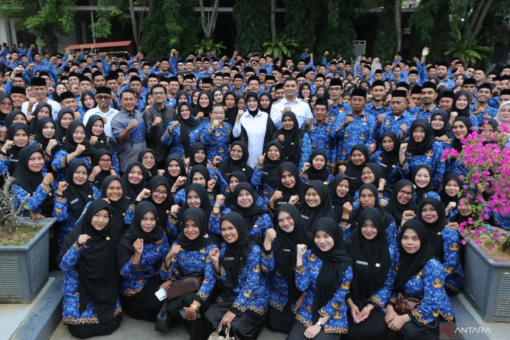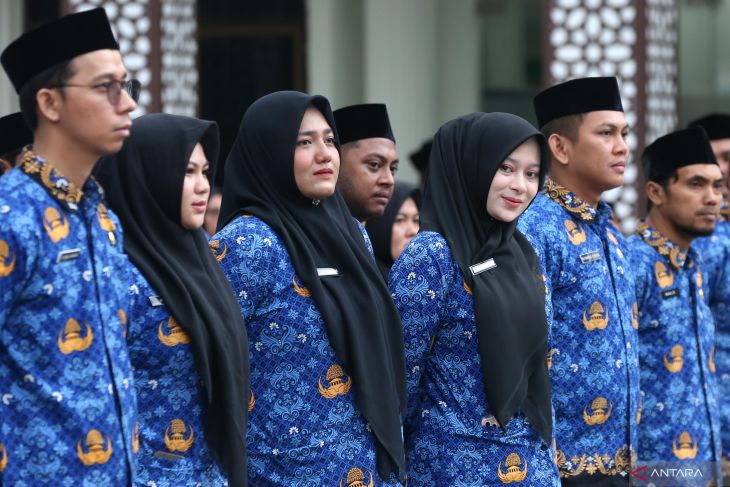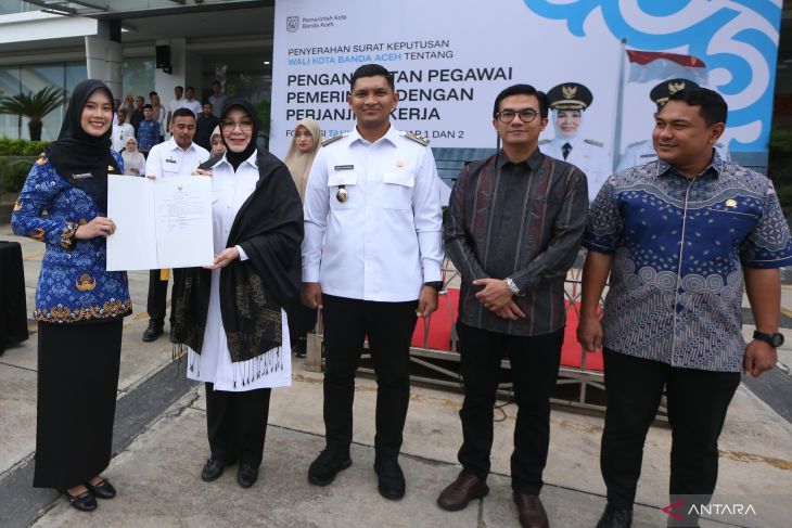 Penyerahkan surat keputusan pengangkatan kerja kepada Pegawai Pemerintah dengan Perjanjian Kerja (PPPK) pemerintah daerah (kiri) di halaman Balai Kota, Banda Aceh, Aceh, Rabu (15/10/2025). Pemerintah Kota Banda Aceh menyerahkan 1.149 surat keputusan Wali Kota tentang pengangkatan tenaga PPPK tahap I dan II formasi tahun 2024 untuk melaksanakan tugas sesuai penempatan dengan memegang teguh komitmen dan menjaga integritas sebagai bagian dari aparatur sipil negara. ANTARA FOTO/Irwansyah Putra