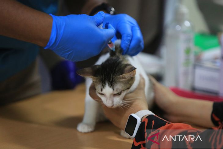 Dokter hewan menyuntikkan vaksin kepada kucing saat berlangsung vaksinasi rabies gratis di Laboratorium Balai Karantina Aceh, Banda Aceh, Kamis (16/10/2025). Balai Karantina Hewan, Ikan dan Tumbuhan provinsi Aceh memberikan layanan vaksinasi rabies gratis untuk kucing dan anjing guna pencegahan dan penyebaran penyakit Rabies di daerah itu dalam rangkaian kegiatan sosial memperingati HUT ke-148 Karantina Indonesia. ANTARA FOTO/Ampelsa.