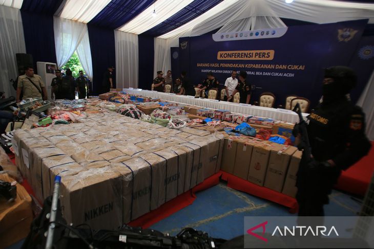 Petugas Kanwil Bea dan Cukai menggelar barang impor rokok ilegel dan barang sitaan lainnya hasil pengawasan dan penindakan sepanjang tahun 2025 saat konferensi pers di Banda Aceh, Aceh, Rabu (22/10/2025). Direktorat Jenderal Bea dan Cukai mencatat capaian hasil pengawasan secara nasional hingga akhir September 2025 sebanyak 22.064 penindakan dengan total nilai barang mencapai Rp6,8 triliun dan pengembalian keuangan negara melalui mekanisme ultimum remedium dengan nilai Rp181,1 miliar. ANTARA FOTO/Ampelsa.