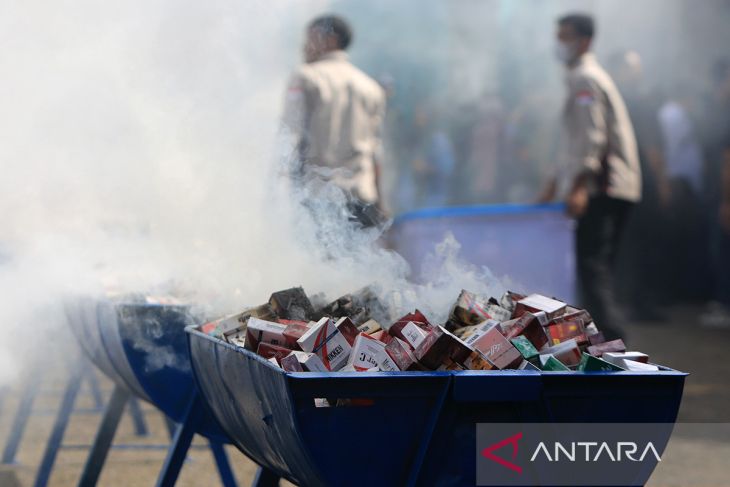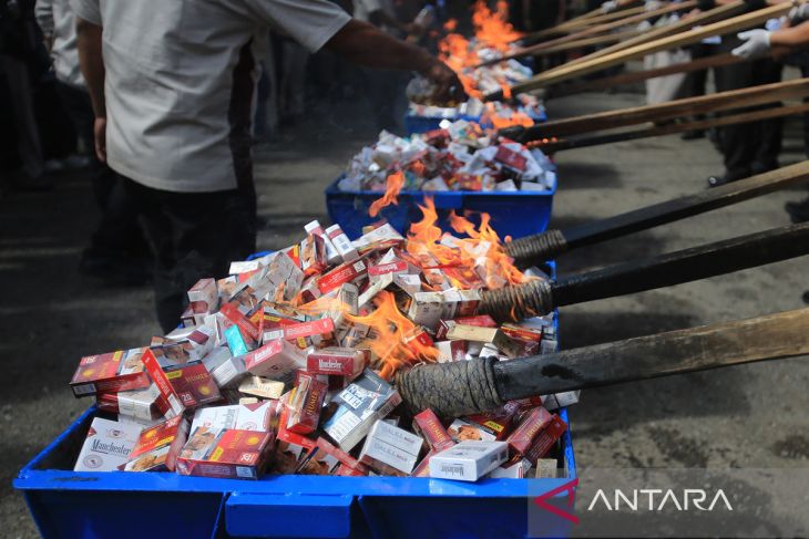 Petugas Kanwil Bea dan Cukai memusnahkan rokok impor ilegal dengan cara dibakar seusai menggelar konferensi pers di Banda Aceh, Aceh, Rabu (22/10/2025). Direktorat Jenderal Bea dan Cukai mencatat capaian hasil pengawasan secara nasional hingga akhir September 2025 sebanyak 22.064 penindakan dengan total nilai barang mencapai Rp6,8 triliun dan pengembalian keuangan negara melalui mekanisme ultimum remedium dengan nilai Rp181,1 miliar. ANTARA FOTO/Ampelsa.