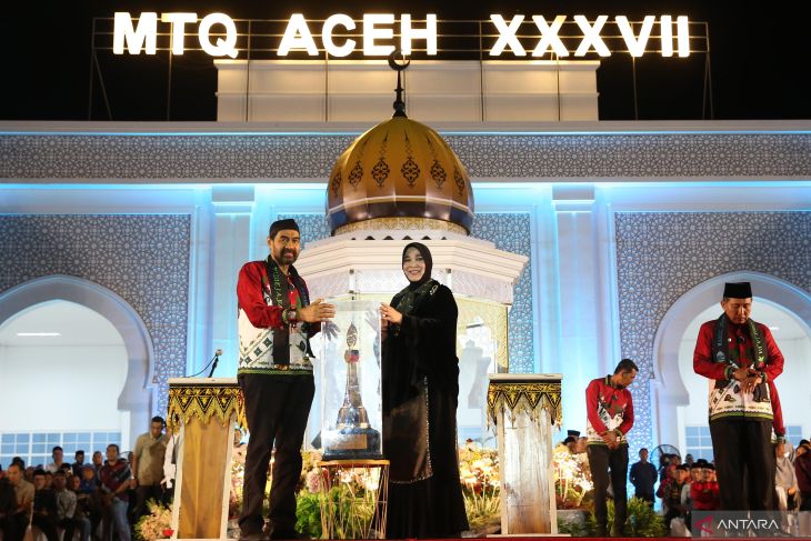 Gubernur Aceh Muzakir Manaf bersama Forkopimda Aceh menekan tombol yang ditandai dengan terbukannya Alquran berukuran besar pada pembukaan Musabaqah Tilawatil Qur’an (MTQ) ke-37 Tingkat Provinsi Aceh di Kompleks Perkantoran Pemerintah Kabupaten Pidie Jaya, Meureudu, Sabtu (1/11/2025) malam. Sebelum seremoni pembukaan Wali Kota Banda Aceh Illiza Sa’aduddin Djamal menyerahkan piala bergilir kepada Gubernur Aceh. MTQ ke-37 yang diikuti 23 Kabupaten/Kota akan Berlangsung hingga 8 November mandatang.