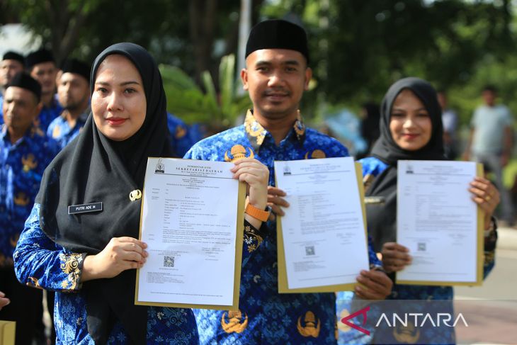Tiga Pegawai Pemerintah Dengan Perjanjian Kerja (PPPK) memperlihat surat keputusan pengangkatan seusai mengikuti upacara di Kantor Gubernur Aceh, Banda Aceh, Senin (3/11/2025). Pemerintah provinsi Aceh menyerahkan Surat Keputusan (SK) pengangkatan kepada 1.137 Pegawai Pemerintah dengan Perjanjian Kerja (PPPK) tahap II formasi tahun anggaran 2024 yang terdiri dari sebanyak 605 tenaga teknis, 525 tenaga guru dan 7 orang tenaga kesehatan. ANTARA FOTO/Ampelsa.